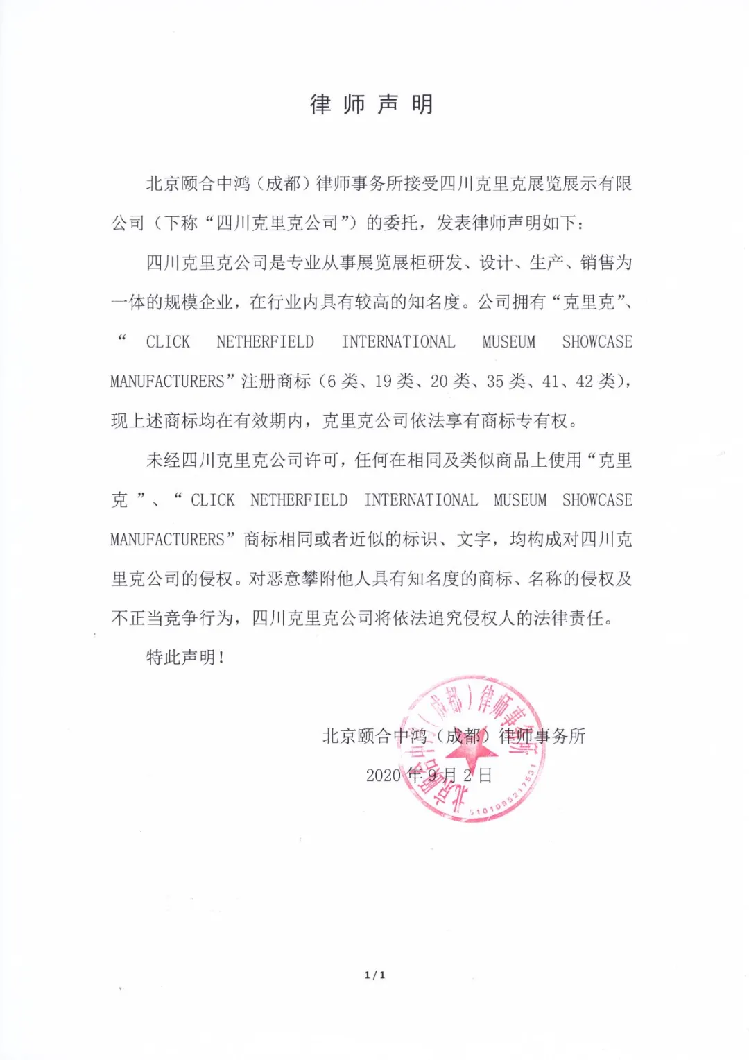 北京頤合中鴻(成都)律師事務(wù)所接受四川克里克展覽展示有限公司(下稱“四川克里克公司”)的委托,發(fā)表律師聲明如下: